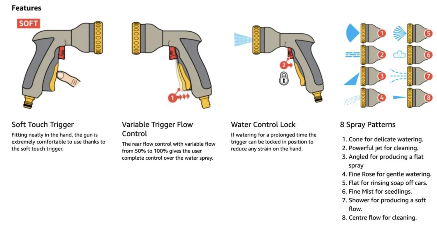 Features Stylish metal bodied gun spray featuring eight varied spray patterns Powder coated die cast metal body. Comfortable, soft touch ergonomic handle. Lockable on/off trigger. Eight spray patterns for all-purpose cleaning and gardening tasks.