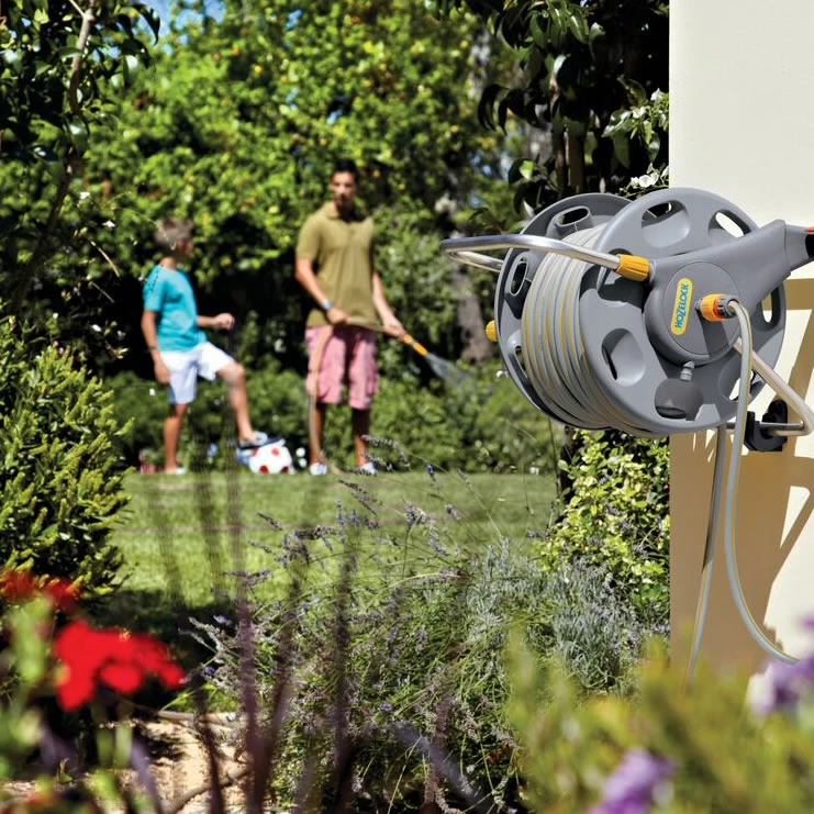 The Hozelock 2 in 1 reel provides both the tidy and easy use of a wall mounted hosereel, while also offering the convenience of a free standing model. Complete with a 50m multi-purpose 12.5mm hose, the product is more than adequate for most gardens and will make watering plants or cleaning the car as easy as a walk in the park. A handle is also mounted to the side of the reel for help when rewinding the pipe back. When finished, the hosereel sits neatly and discreetly on a wall.