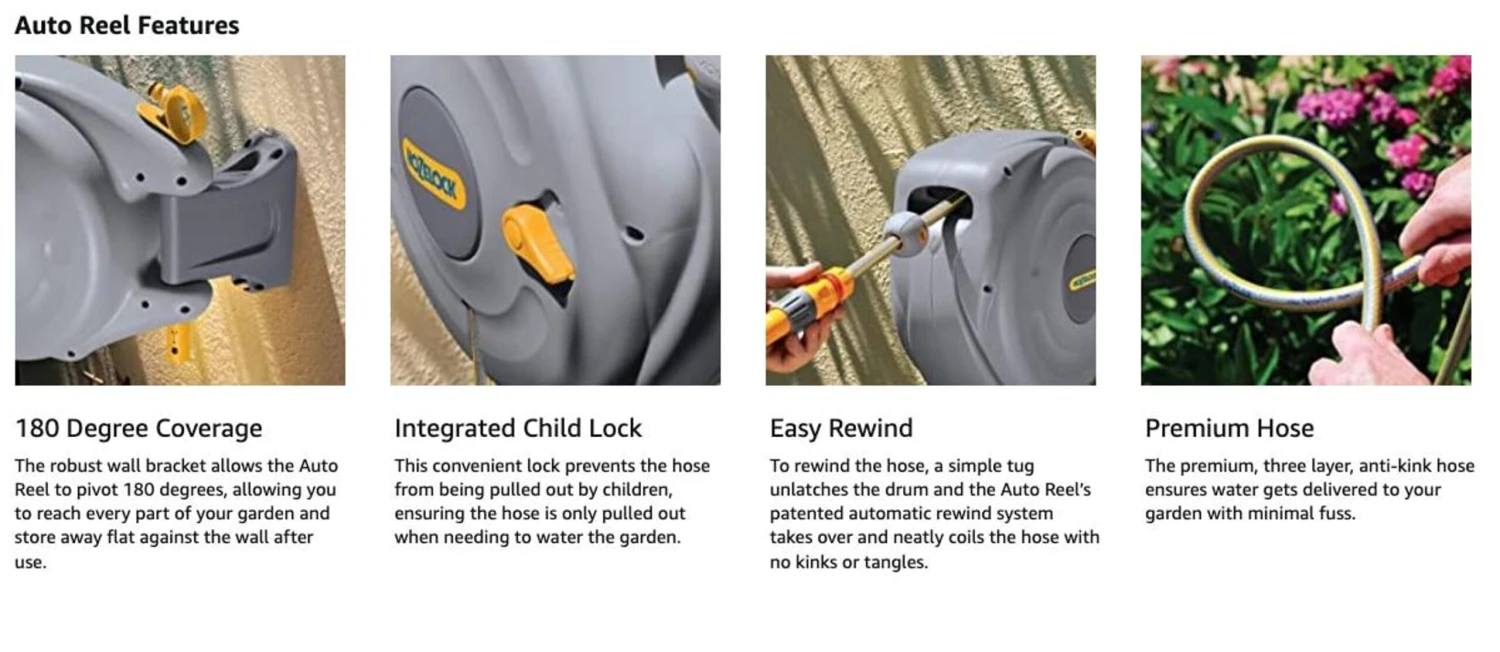- All the fittings you need – complete with tap connectors, hose attachments, feeder hose and an adjustable spray nozzle, the Auto Reel comes with all the necessary parts you need to get watering straight away.