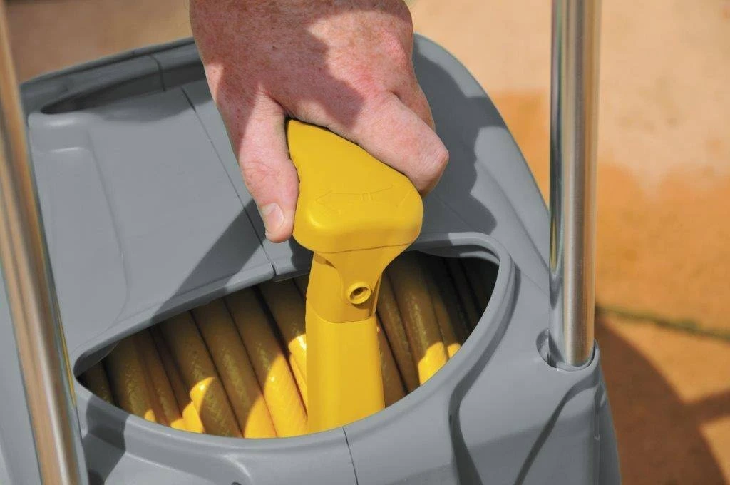 Easy to move – The soft grip towing handle and integrated wheels ensure the reel is fully portable.