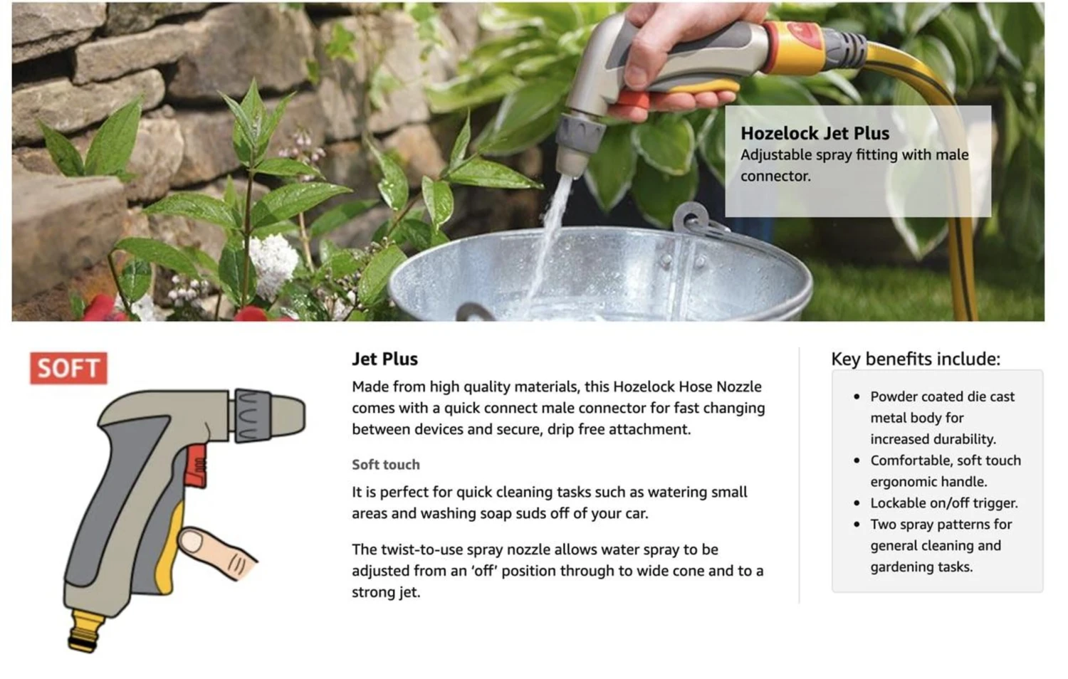 With a powder coated die cast metal body, the Hozelock Jet Plus combines fantastic looks, comfortable soft touch ergonomics with a range of genuinely useful, class leading spray patterns. Patented infinitely variable trigger flow control – the harder you squeeze the more water you get. Two stage locking trigger, lock at 100% flow and 40% flow. Two spray patterns: Powerful Jet for cleaning and Cone for covering wide areas fast that is gentle enough to protect delicate and new flowers.
