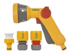 Hozelock Multi Spray Gun with a lockable front trigger, which turns water on and off, and an easy-to-use thumb-operated flow control switch.