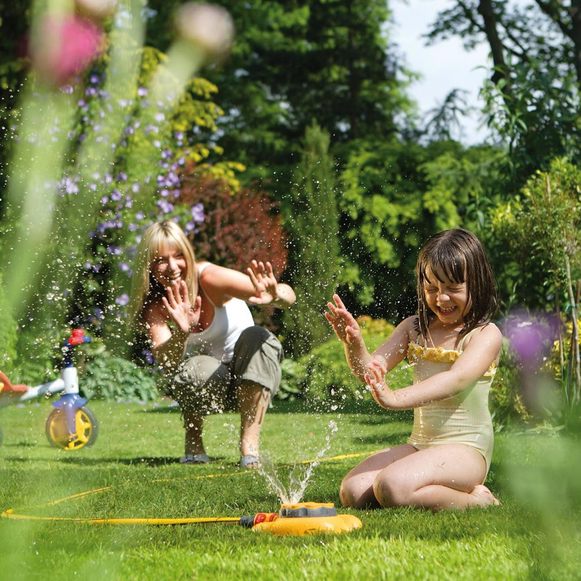 Complete with soft-touch easy-grip adjuster ring for changing spray patterns even with wet hands. Max area coverage 79m² (Max diameter 10m). Mounted on sled base to suit all surfaces.